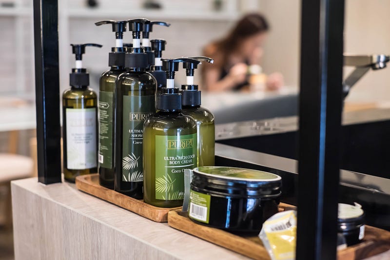 ภายในร้านจะมีโซนที่ขายผลิตภัณฑ์ความงามจากมะพร้าวด้วยนะคะ โซนกลางร้านก็มีเซ็ตทดลองไว้ด้วยค่ะ
