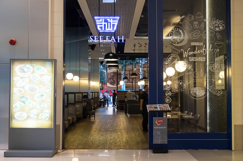 พิกุลมาทานอาหารที่ร้านสีฟ้าสาขาพระราม 9 ตั้งอยู่ที่อาคาร The Ninth Towers ชั้น G อาคารนี้จะอยู่หลังเซ็นทรัลพระราม 9 ค่ะ เดินเข้ามาในร้านเราก็จะเห็นกระดาษแนะนำเมนูบนโต๊ะของเดือนตุลาคมที่เป็นเรื่องเกี่ยวกับ 4 เมนูอร่อยต้นตำรับที่ได้รับการรีวิวสูงสุกจากแฟนประจำของสีฟ้า ที่ท้าให้ทุกคนลอง