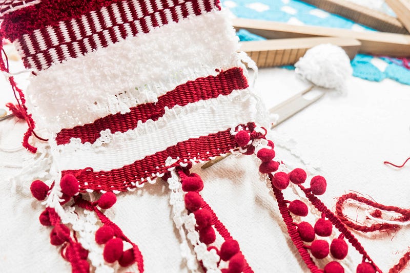 หลังจากทอเส้นด้ายสีแดงได้ประมาณ 5 แถว คุณครูก็แนะนำให้ทำพู่ตุ้งติ้ง จะมีลักษณะเป็นสายห้อยๆ คือเราสามารถเลือกใส่ได้หลายแบบเลยค่ะ ไม่ว่าจะเป็นลูกไม้ เศษผ้าหรือว่าปอมๆ ส่วนตัวพิกุลเลือกใช้เป็นปอมๆสีแดง กับลูกไม้สีขาวค่ะ