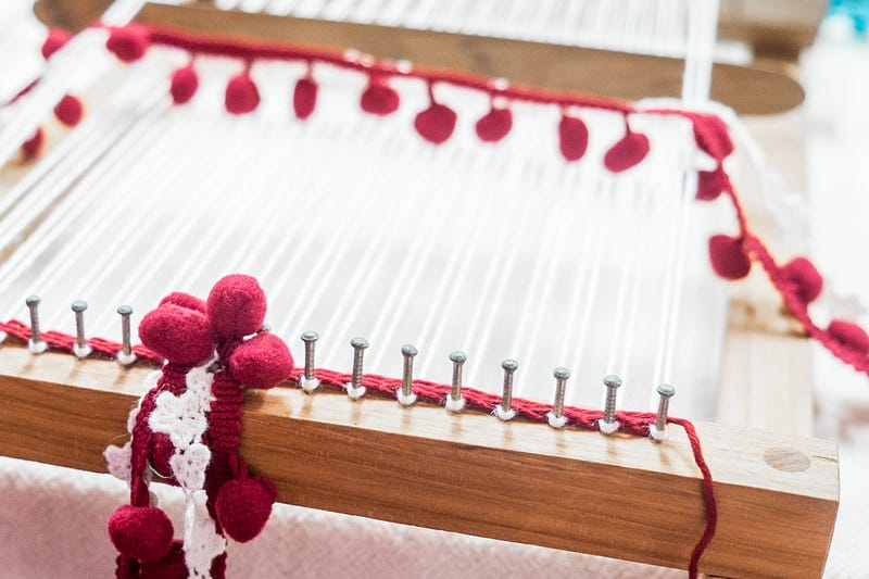 การทอผ้ากี่พกพานี้จะต้องมีการพันเส้นด้ายยืนก่อนค่ะ (เส้นสีขาวในภาพ) โดยที่เส้นด้ายยืนนี้ควรตึงแบบสายกีต้าร์เลยค่ะ เป็นเส้นที่เป็นโครงของผ้าที่เราจะทอค่ะ สำหรับเส้นด้ายที่ใช้ในการทอนี้จะเป็น Cotton Soft หาซื้อได้ตามร้านงานฝีมือทั่วไปค่ะ