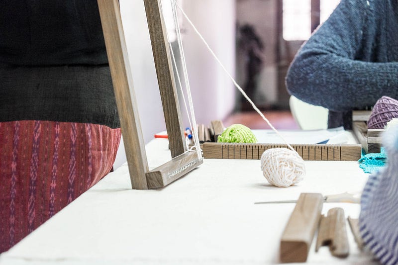 ขึงเส้นด้ายยืนจนตึงแล้วก็มาเริ่มทอผ้ากันเลยดีกว่า… ลืมบอกไปค่ะ สำหรับคนที่มาเรียนคอร์สนี้ จะได้กี่ทอผ้าไม้สักกลับบ้านด้วยนะคะ สามารถไปฝึกทอที่บ้านได้เลย
